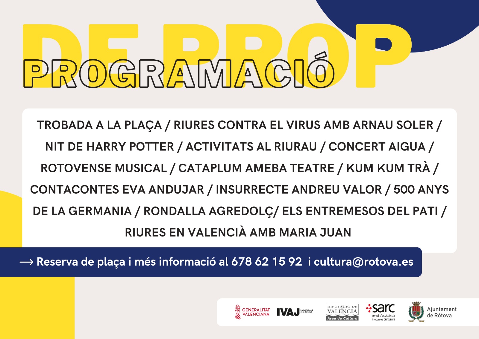 Recordeu que cal reservar plaça per a tots els esdeveniments. Reserva i més informació a través del telèfon 678 62 15 92 i el correu electrònic cultura@rotova.es.